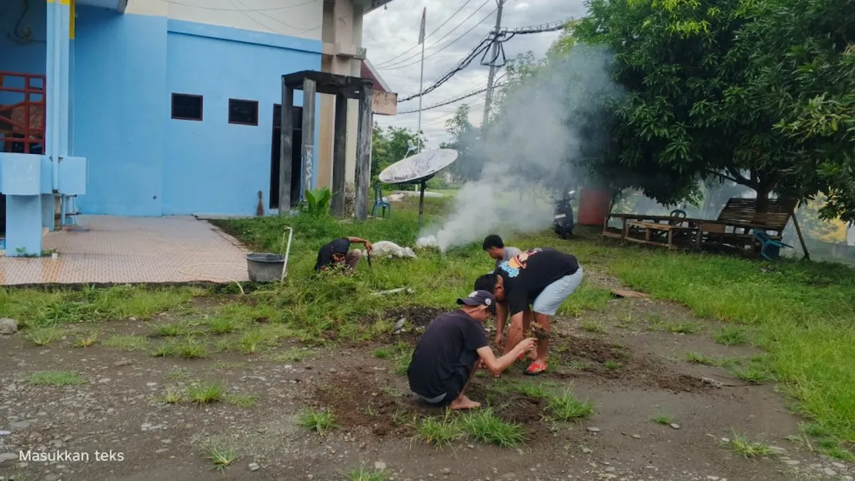 warga dan aparatur boltim potong rumput lapangan desa jumat asri