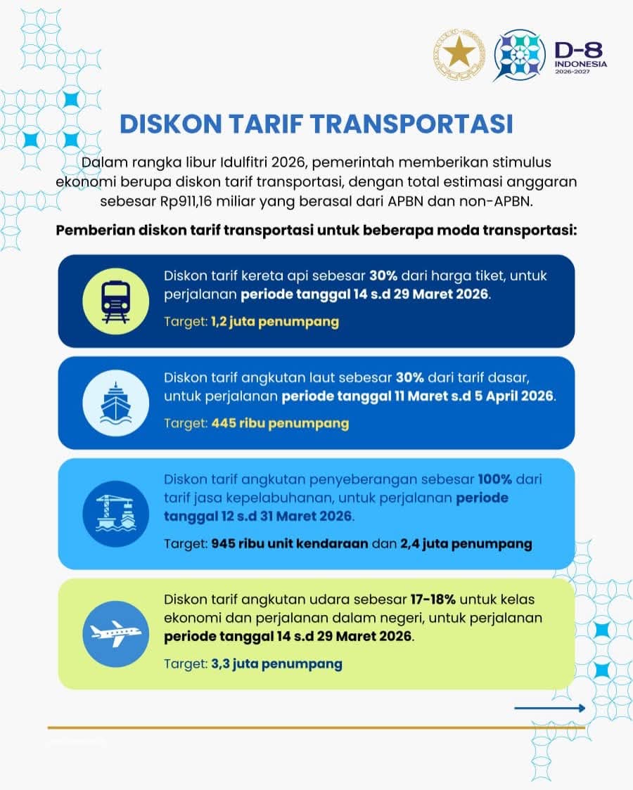 Untuk tujuan tersebut, pemerintah mengalokasikan Rp911,16 miliar stimulus transportasi. Dana ini mendukung diskon tarif kereta api, kapal laut, dan pesawat udara.