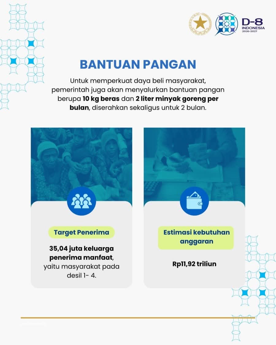 Pada sektor perlindungan sosial, pemerintah menyalurkan bantuan pangan kepada 35,04 juta Keluarga Penerima Manfaat (KPM). Bantuan tersebut mencakup 10 kilogram beras dan 2 liter minyak goreng per bulan selama dua bulan.
