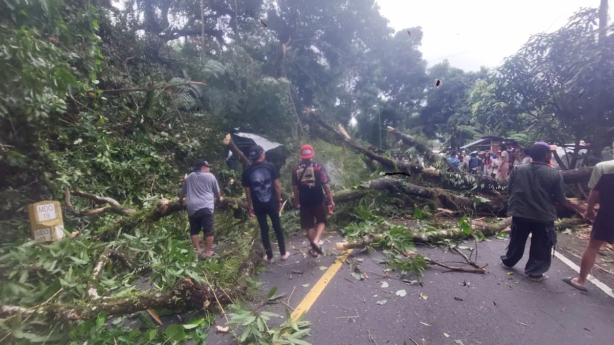 Warga berkumpul di sekitar lokasi pohon tumbang yang menghambat arus kendaraan.