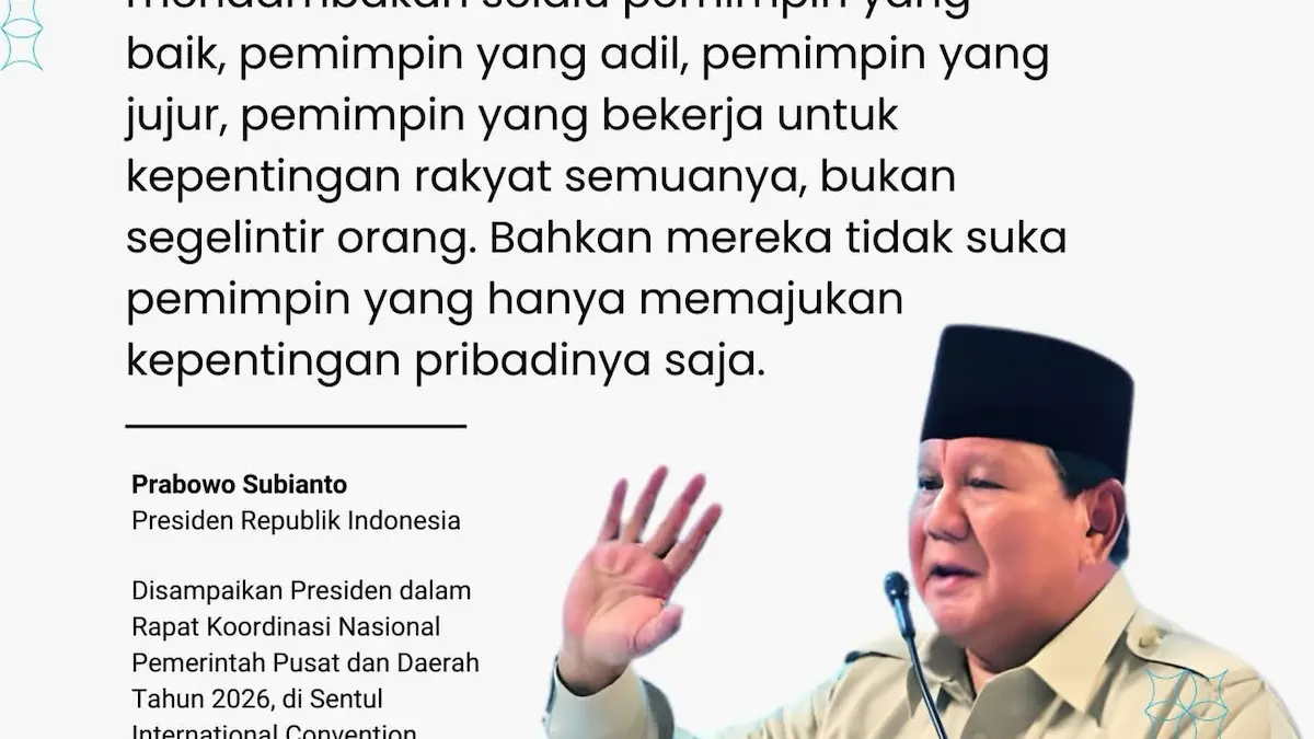 Pesan tersebut disampaikan Presiden dalam pembukaan Rapat Koordinasi Nasional (Rakornas) Pemerintah Pusat dan Pemerintah Daerah Tahun 2026 yang berlangsung di Sentul International Convention Center (SICC), Bogor, Jawa Barat, Senin (2/2/2026).